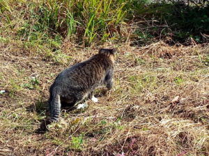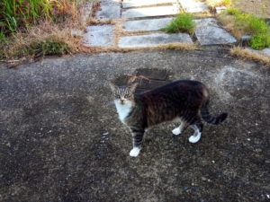 ピーマンの麻紐を結びなおしていたら、ご飯をくださいコールをしながらチャーちゃんがやってきました。この仔はどこかで人間と接触があった仔ですね。頭を撫でさせてくれます。『授乳の時間が迫っているので、ピーマンより先にお願いします』、と言われて先にご飯の準備。その音で福とうめも家に入って来ました。