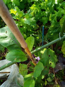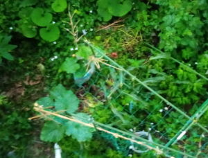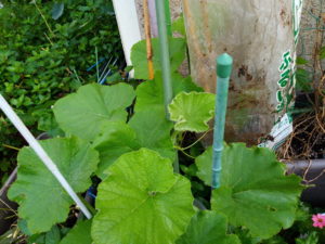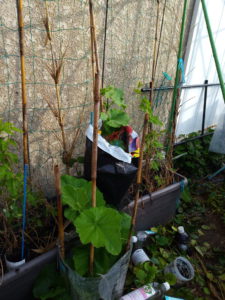 昨夜の雨水が乾くまでどのくらい掛かるかしら。南瓜たちも篠竹を上り始めました。