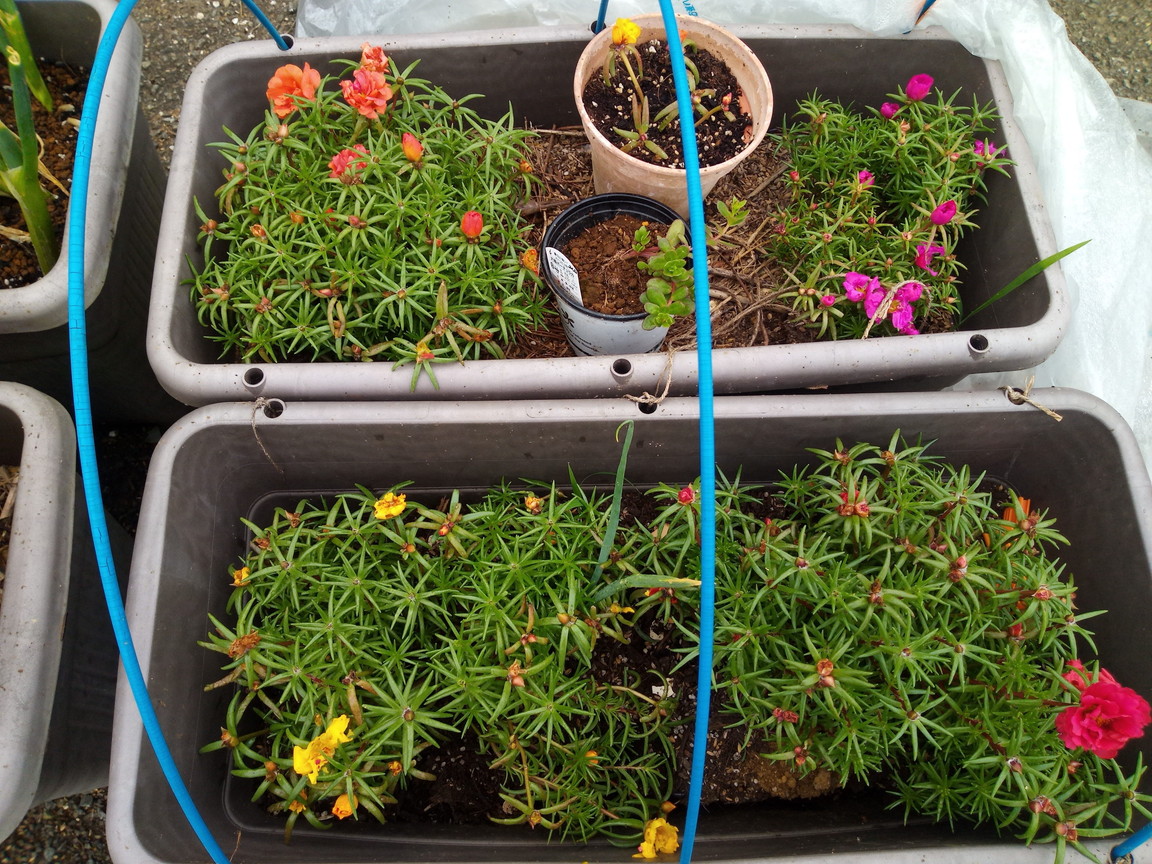 やっちゃん動画で長雨に弱いポーチュラカの話を聞きましたので、プランターで雨避け栽培をしています。今の処順調に育ってくれています。始めは花もイジケテいて株も小さくプランターに二株でスカスカでしたが、今はスペースの取り合いをやっています。
