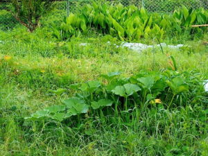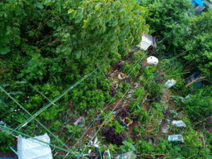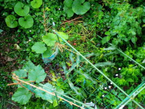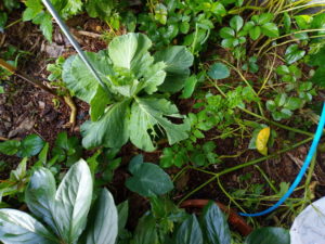 右: 柿木下の里芋(石川早生)の処に目の前に茂ったミントを今回は放り投げて処分しました。次回は脇の通路の畝のミントで、例えば浴剤とか何かをします。跡にはサツマイモ高系14号の挿し穂を10数本挿しました。