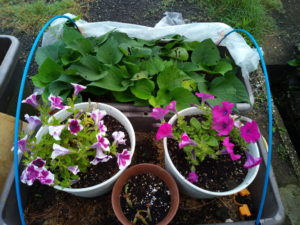 左: ペチュニアの農ビを外しました。蒸れちゃうよねぇ。
