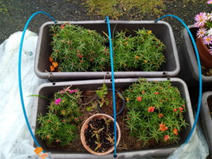 右: 雨が苦手なポーチュラカも農ビの下で夜を過ごしました。
