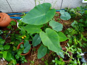 左: 脇の通路の里芋。赤芽は沢山葉を展開しているものが多いです。