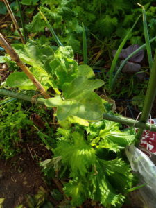 右: 千両二号。根本に出ているのは昨年植えたロマネスコの葉。