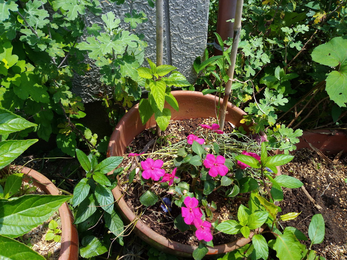 一番目立つインパチェンスが実は一番ちび助で、それ以外は背高のっぽさんです。