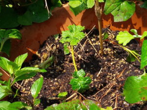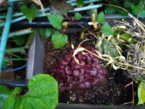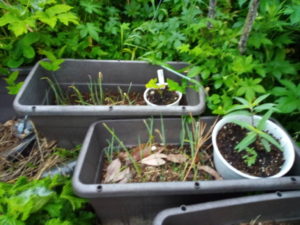 右: 丸い小鉢で育てていた赤縮緬紫蘇をジャガイモ+葱プランターへ移植しました。ラディッシュの種と一緒です。
