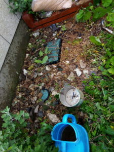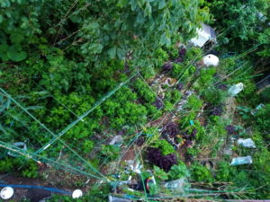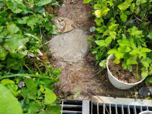 三毛ちゃんとチャーちゃんの二重唱で、あ、雨が降っているから早めに上げなくちゃね。それほど沢山は食べませんでした。その後です、問題は!私のサツマイモ畝が掘り返されていました。そういう事がないように団ポールを何本も置いておいたのですが、それが乱れていました。そこで土留めのボトルをしっかりおいて、畝上には空のペットボトルを7-8本置いておきました。