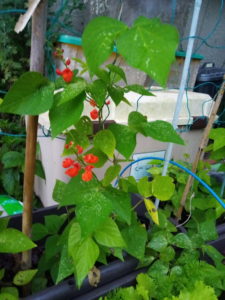 左: ベニバナインゲンの花が着いて来ました。Yさんの家が一番よく生長していますし、Wさんやお隣も早くから花が着いていました。今年はプランターなので、土の量が不足するか…そこが心配です。来年はプランタ―の底に細工をします。穴を空けるだけなんですが根っこが延びていけるようにするつもりです。