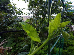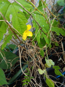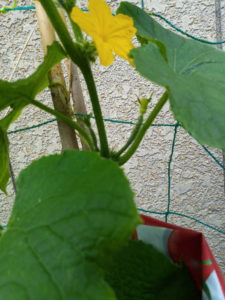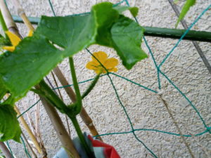ゴーヤの第一花と胡瓜の第一花。両方とも雄花みたいですね。