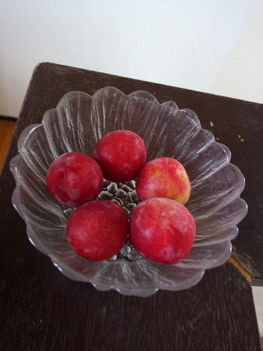 巴旦杏の仲間じゃないか、という事で正式名は分かりませんが。青い実を食べても新鮮な美味しさ。赤い実を食べると熟した美味しさを感じました。熟しすぎたのは渋みが出るとのことでした。