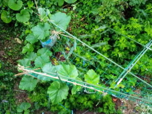 左: 黒い麻紐を巻きひげが掴んでいます。南瓜の生長頭。