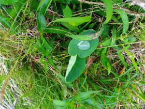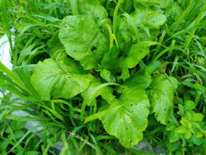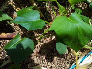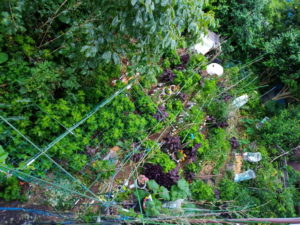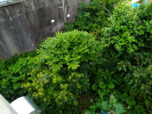 右: 八手の葉も貴重な通路に敷く材料です。これはなかなか分解しないから夏場に良いかな。この下がキョンの通り道だからくずの葉も取り去ります。葛の葉は蛋白質が豊富なので、トマトの畝に細かくしてマルチング。裏の木も枝落としをしておこう。枝を落としたら、小さくして実梅の根本へ置きます。草でも何でも実梅の根本です。野菜生ごみは年に1-2回程度です。