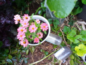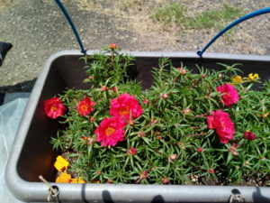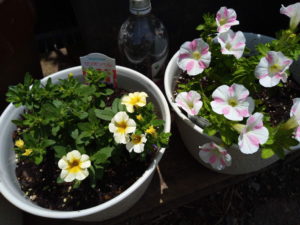 中: ペチュニア桃色ハートにピンクの色が戻りました。ミリオンベルも花数が増えて来ました。