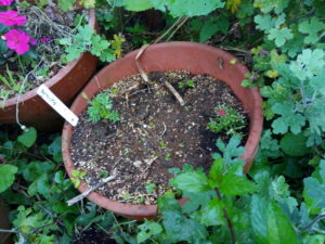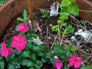 右: 今日は紅色のインパチェンスの鉢。まだヤナギハナガサもラッシャンセージも小さいです。