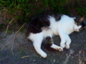 写真を撮りながら、ふと下を見たら首に白い筋が入った猫…ン!?福だ!福が三毛ちゃんの餌を食べていました。お腹空いたのかな?昨日の夜は食べに来なかったからね。その後で、砂掛けをしていました。外猫に餌を上げるのが氣に入らないんでしょうね(笑)。
