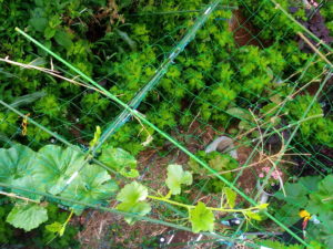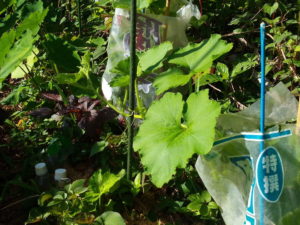 中: 近くの支柱につかまり始めた南瓜。今日の仕事はこの南瓜に支柱を作る事です。