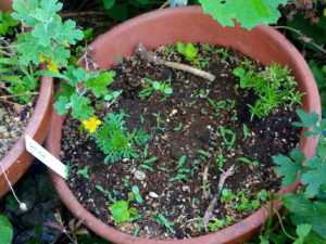 左: 玄関前の鉢の零れ種マリゴールドに花が咲きました。まだ蕾ですが。