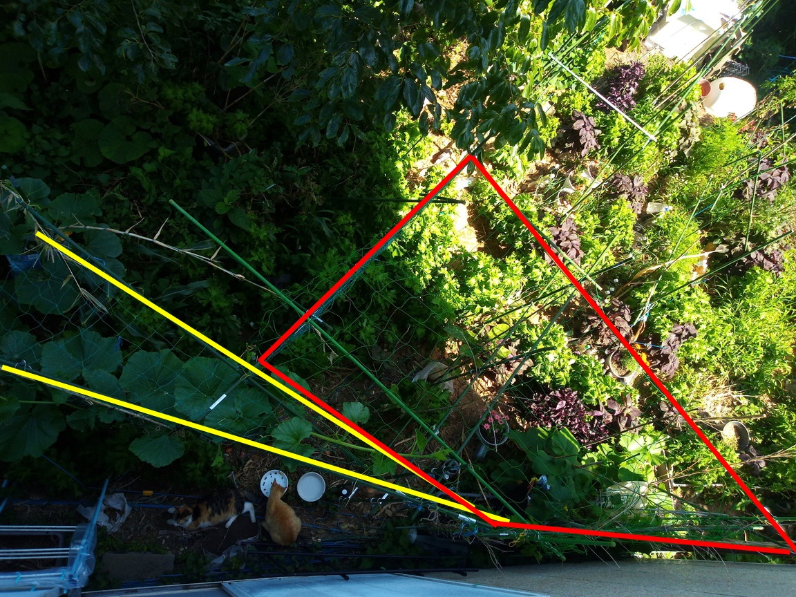 10時過ぎの暑い中で支柱組をやって、南の四―二畝を四角に囲んで組みました。こちらはネットは四畝以外は今の処、掛ける予定はありません。