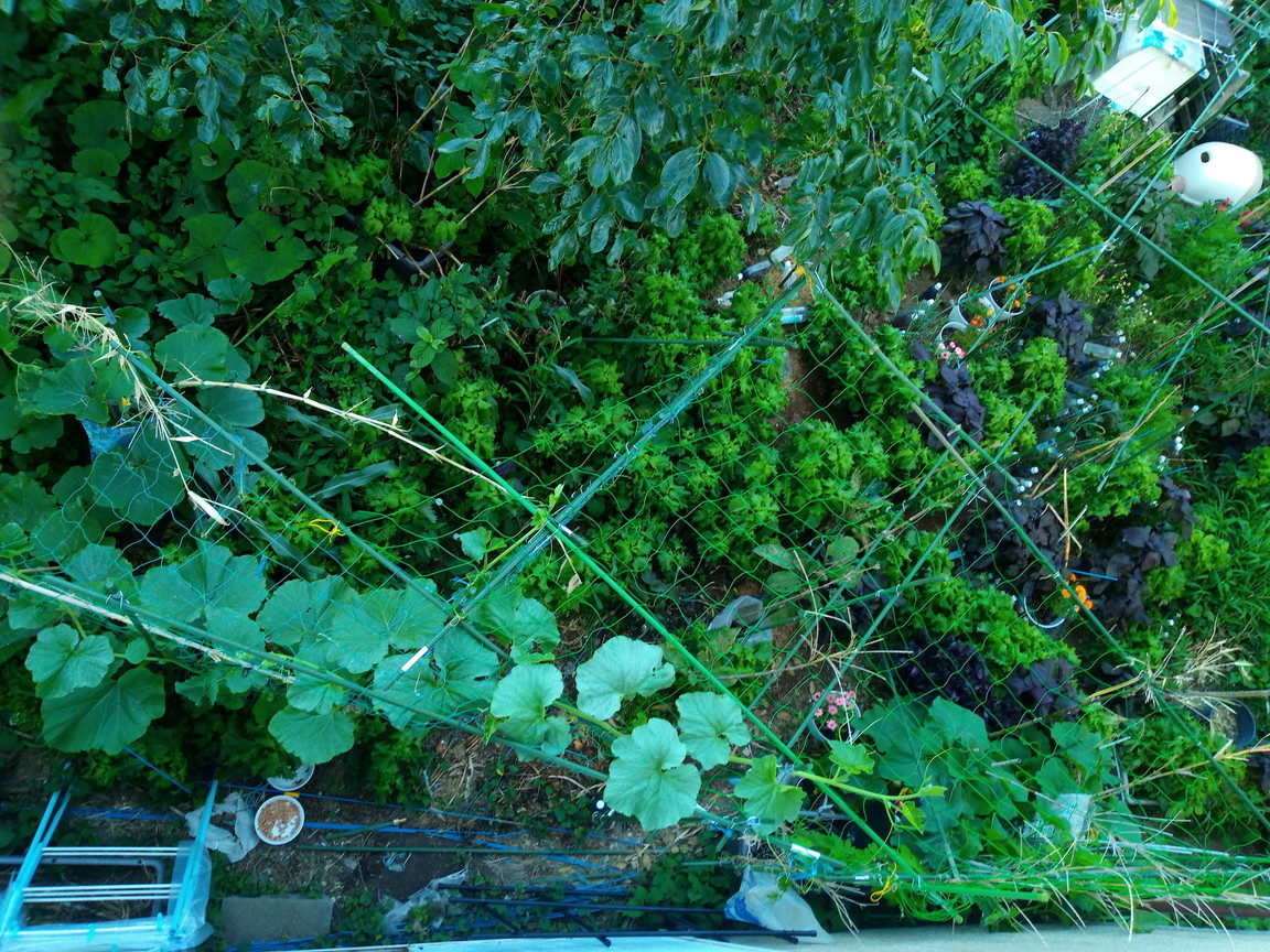 虫害に会い、タイムラグが出来た苗もありましたが、それぞれの個性で伸びてきたので、本葉八枚目くらいで親蔓を摘心し、子蔓、孫蔓を出させ、あとは毎日の水やりと時折追肥をするだけで、胡瓜さん・南瓜さんに任せっきりでした。来年はサツマイモを止めて、庭中に南瓜、胡瓜、ゴーヤ、豆類を植えるつもりです。何よりもとても面白かったのでした。