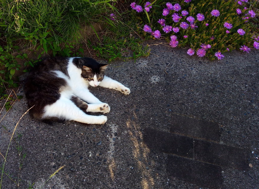夕方になると氣温がストンと落ちて冷たい風が吹き始めます。西の山からはカナカナの歌が響き、猫たちが水を撒いたコンクリートのスロープに戻ってきます。ホッとする一時です。