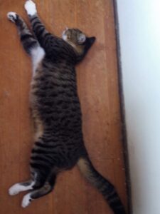 お昼を食べに階下へ降りようとしたら、廊下で行倒れている猫ちゃんが居ました。うめの、暑い時のお氣に入りの場所です。時々福も夜中にひっくり返っています。笑 この後、うめは私のサバの水煮缶を一口食べて出かけました。ツナの水煮缶には大騒ぎします。