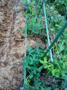 雨は長くは降り続くことはなさそうだし、土も湿り気を帯びていないので、作業を始めました。滅多に使わないスコップを持ち出し、通路を20-25㎝位掘り、土を3畝に乗せ、2畝の落花生を守るために土寄せをして支柱も立てました。写真右