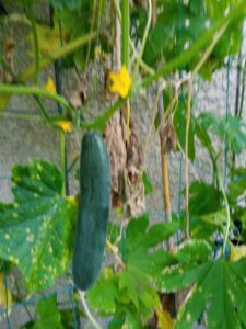 右: 夏涼みも未だに実を付けて呉れます。表面にある粉をブルームと呼びますが、最近はこのブルームがないキュウリが人気です。味?ブルームのある方が美味しいと思います。