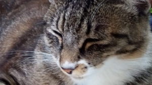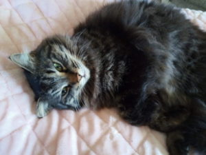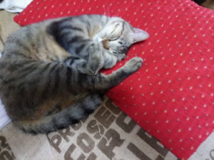 凄く気持ちが良くお昼寝が出来てしまう時間帯です。寝ていたら福が『ねぇ、何か頂戴。お腹が空いた。』でも、起きられませんでした。次はうめの爪を二の腕にチクン、チクン、と感じました。薄目を開けると前足で私をつついて起こそうとしています。やはりお腹が空いた、そうです。ここでカリカリ+ちゅ~るを大奮発。トラ子も大喜び。
