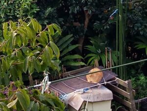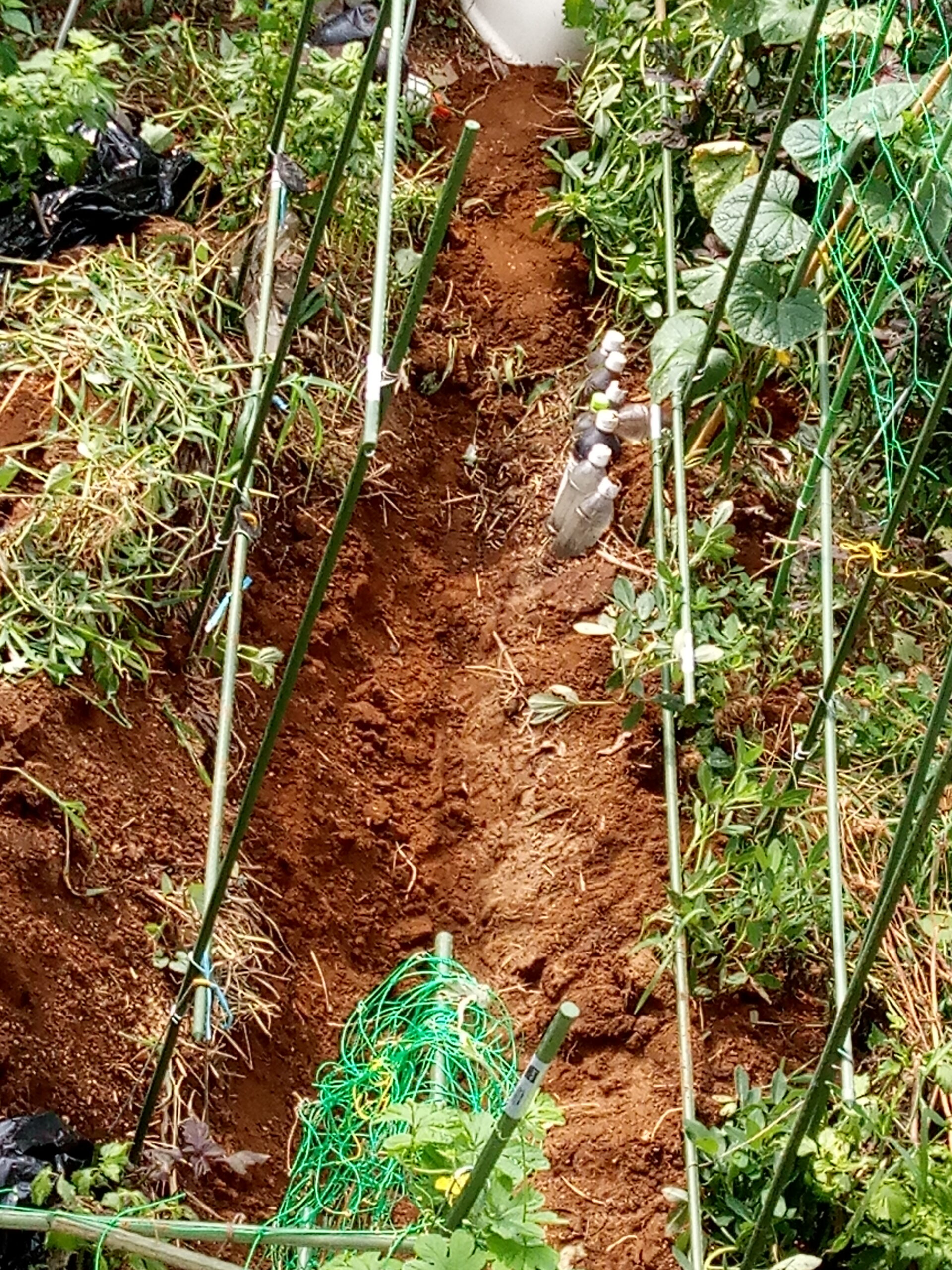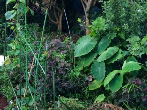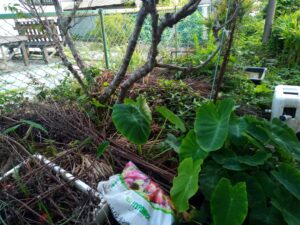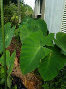 左: 一月前に捨てた、ダメになったと思った里芋の復活です。芋は摂れませんが、来年につなげましょう。