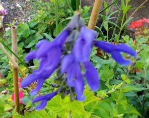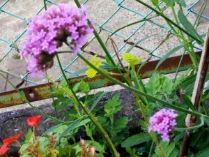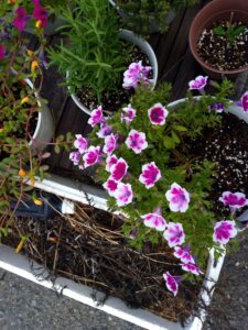 槿と小豆フラッペ(ペチュニア)。小豆フラッペは雨で肥料が薄まったみたいな色になりました。