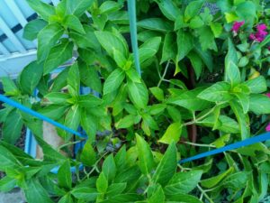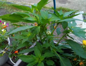 中: Iさんから頂いた唐辛子の苗は2㎝もなかったのですが、此処へきて白い花が付きました。後2本は5㎝にも満たない苗です。