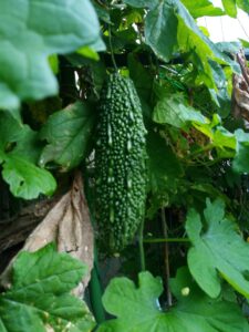 右: 強の収穫予定のゴーヤ。奥に胡瓜が一本ありました。