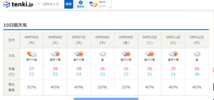 10日間予報によると最高気温、最低気温ともに心地よいものになって行きそうです。台風が西側の進路を取りそうなので、関東地方の予想からは雨が消えました。大雨は困るけれど、週一位で雨は欲しいですね。
