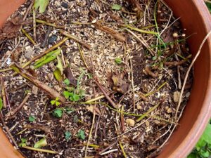 左: 数日前までは紫蘇が茂っていました。実はクロッカスの鉢で、注文中のブルークロッカスが10月に届いたら植えて、元の位置に戻します。
