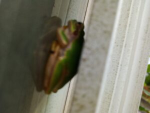 下段: 昨日から昼間は玄関の桟の陰でお休み中のカエルさん、体長2㎝です。夕方から4時間位、玄関灯に集まる虫を食べているんですね。
