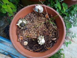 右: お隣から頂いて美味しく頂いたサザエは蓋と殻は植木鉢へ。半分はクロッカスの植木鉢へ、後はそれぞれ適当なところへ入りました。天然石灰は雨でゆっくりじんわりと溶けます。