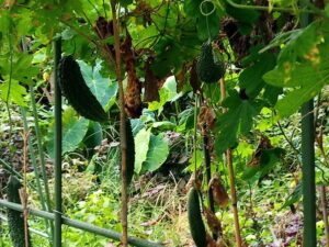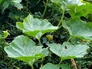 右: お盆以降の南瓜で初めて結実したのですが、黄色くなり始めています。もう南瓜の根が疲れているのかもしれません。