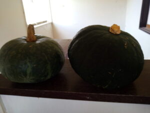 左の南瓜がYさんから頂いたものです。大きくどっしりしています。地上で育ったから空中栽培とは色も違います。お天道様をたっぷり浴びて育った抹茶色です。我が家の空中栽培は色が濃いですね。