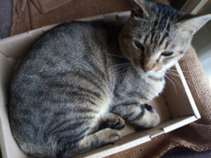 俺、タイガー、この辺のボス。おれ、こんなちっちゃな箱にも入れる。体、柔らかいぜ。ちょっと窮屈だけどな。この辺じゃ一番体重重いぜ、オレ。