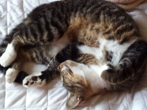今朝は四猫さんの食事でした。タイガーさんは我が家のケージ120Hx70Dx100Wが氣に入った様で昨夜はそこで寝ていたみたいです。蒸し暑さが残っていましたからうめは廊下のバスケットの中、福は表で、トラ子は猫ソファでした。雨が吹き込むからガラス窓を閉める、すると暑い!の繰り返しです。