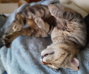 かえって来たトラ子が私左にいて、福が右にいます。男の仔たちは甘えん坊。女の仔の甘え方はツンデレです。でも、私の寝床の私が寝た場所でうめは寝ます。これが女の仔の甘え方。