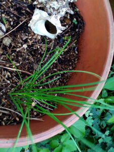 左: 玄関前の鉢に出たのは韮の若苗でしょうか。