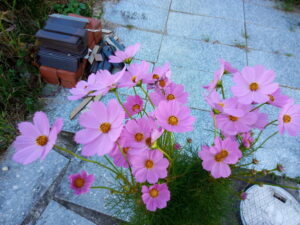 左: 西隣さん玄関前のコスモス、そう、この色ですよ。