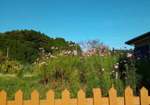 右: 我が家の物干しから見たコスモスはとても綺麗です。ハレーション起こして色が飛んでしまいました。