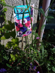 右: 今年西隣さんで実験して綺麗だったので、矢車草のタネを蒔きました。篠竹支柱の足元にある鉢にも蒔きました。ヤナギハナガサやロシアンセージも一鉢毎にまとめようと思います。