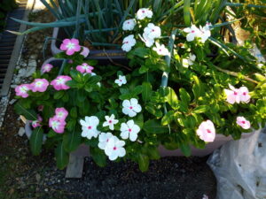 左: 我が家の日日草。ピンチングをして伸びて来ました。今年は越冬の日日草は出ないかなぁ。