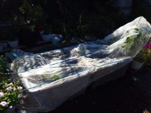 玄関アプローチのプランターの底と地面をチェックして20匹くらいのナメクジを退治しました。どうやってかって?塩です。鉢受け皿に盛塩をしてそこへナメクジを置いて行きました。日日草と葱のプランターは15㎝位は生れているので、今回は様子見です。サンサンネットを掛けていましたが、不織布に替えました。