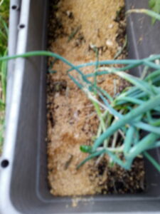 中: 葱が伸びて来たので、苗のトレーと米袋で高さを増しました。