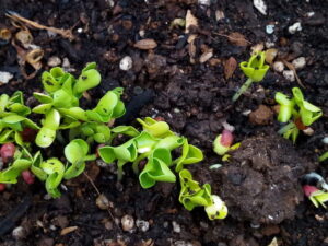 玄関前の鉢では先日蒔いた矢車草の発芽が始まっていました。
