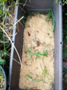 玄関前の鉢では先日蒔いた矢車草の発芽が始まっていました。